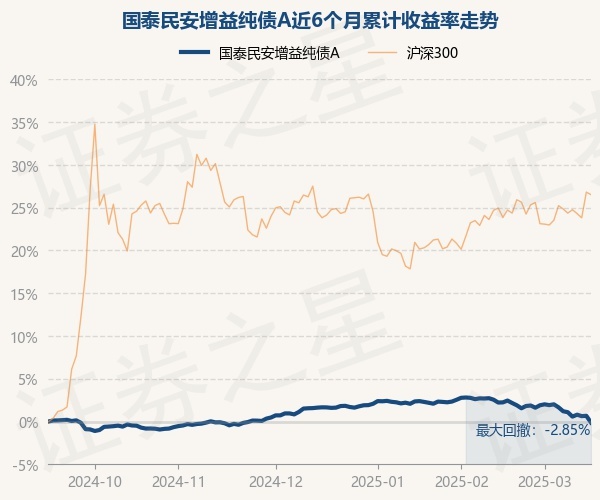 证券之星消息,3月17日,国泰民安增益纯债A最新单位净值为1.0879元,累计净值为1.2498元,较前一交易日下跌0.78%。历史数据显示该基金近1个月下跌2.29%,近3个月下跌1.74%,近6个月下跌0.13%,近1年上涨2.51%。该基金近6个月的累计收益率走势如下图: