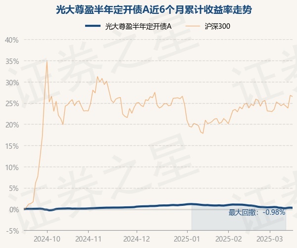 证券之星消息,3月17日,光大尊盈半年定开债A最新单位净值为1.0844元,累计净值为1.2573元,较前一交易日下跌0.03%。历史数据显示该基金近1个月下跌0.6%,近3个月下跌0.53%,近6个月上涨0.31%,近1年上涨1.68%。该基金近6个月的累计收益率走势如下图: