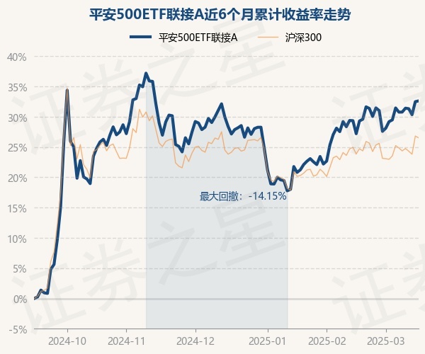 证券之星消息,3月17日,平安500ETF联接A最新单位净值为1.15元,累计净值为1.408元,较前一交易日上涨0.1%。历史数据显示该基金近1个月上涨2.52%,近3个月上涨4.3%,近6个月上涨32.61%,近1年上涨11.72%。该基金近6个月的累计收益率走势如下图: