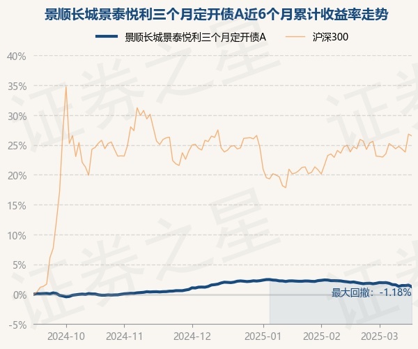 证券之星消息,3月17日,景顺长城景泰悦利三个月定开债A最新单位净值为1.0316元,累计净值为1.1142元,较前一交易日下跌0.27%。历史数据显示该基金近1个月下跌0.82%,近3个月下跌0.72%,近6个月上涨1.25%,近1年上涨4.6%。该基金近6个月的累计收益率走势如下图:
