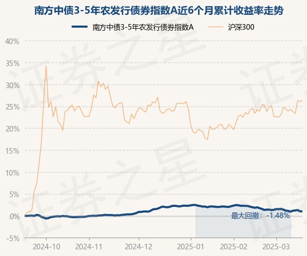 证券之星消息,3月18日,南方中债3-5年农发行债券指数A最新单位净值为1.0991元,累计净值为1.2521元,较前一交易日上涨0.0%。历史数据显示该基金近1个月下跌0.76%,近3个月下跌0.87%,近6个月上涨1.07%,近1年上涨4.26%。该基金近6个月的累计收益率走势如下图: