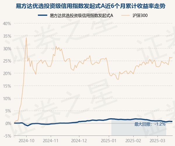 证券之星消息,3月18日,易方达优选投资级信用指数发起式A最新单位净值为1.0267元,累计净值为1.0497元,较前一交易日上涨0.04%。历史数据显示该基金近1个月下跌0.7%,近3个月下跌0.45%,近6个月上涨0.65%,近1年上涨3.05%。该基金近6个月的累计收益率走势如下图: