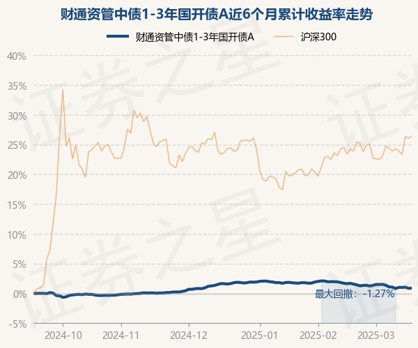 证券之星消息,3月18日,财通资管中债1-3年国开债A最新单位净值为1.0304元,累计净值为1.1084元,较前一交易日上涨0.03%。历史数据显示该基金近1个月下跌0.74%,近3个月下跌0.68%,近6个月上涨0.87%,近1年上涨3.16%。该基金近6个月的累计收益率走势如下图: