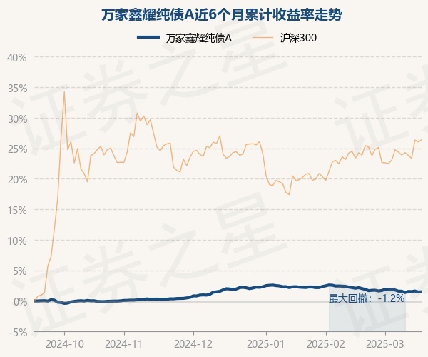 证券之星消息,3月18日,万家鑫耀纯债A最新单位净值为1.0346元,累计净值为1.086元,较前一交易日上涨0.03%。历史数据显示该基金近1个月下跌0.58%,近3个月下跌0.36%,近6个月上涨1.49%,近1年上涨4.0%。该基金近6个月的累计收益率走势如下图: