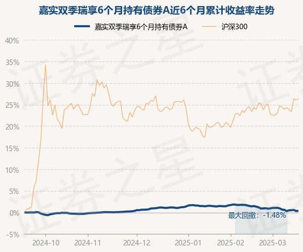 嘉实双季瑞享6个月持有债券A为债券型-混合一级基金,根据最新一期基金季报显示,该基金资产配置:无股票类资产,债券占净值比106.14%,现金占净值比0.94%。