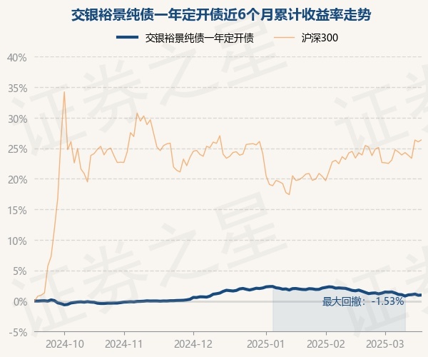 证券之星消息,3月18日,交银裕景纯债一年定开债最新单位净值为1.0396元,累计净值为1.1116元,较前一交易日上涨0.04%。历史数据显示该基金近1个月下跌0.68%,近3个月下跌0.65%,近6个月上涨0.97%,近1年上涨3.2%。该基金近6个月的累计收益率走势如下图: