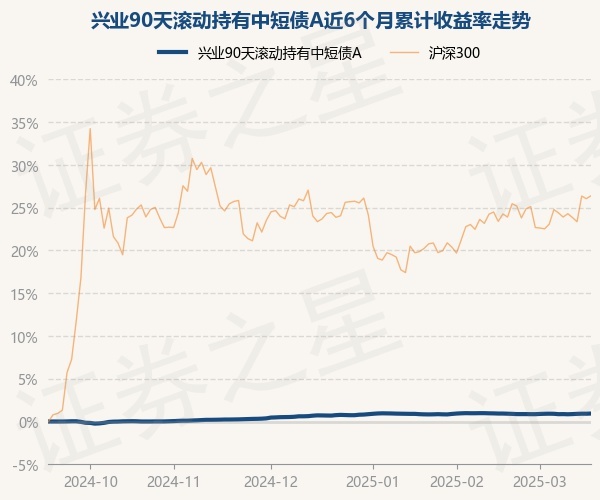 证券之星消息,3月18日,兴业90天滚动持有中短债A最新单位净值为1.0969元,累计净值为1.0969元,较前一交易日上涨0.02%。历史数据显示该基金近1个月上涨0.0%,近3个月上涨0.23%,近6个月上涨0.93%,近1年上涨2.36%。该基金近6个月的累计收益率走势如下图: