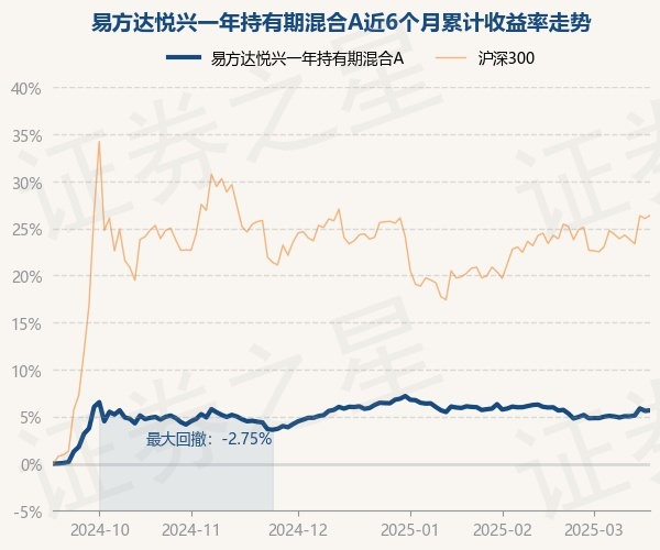 证券之星消息,3月18日,易方达悦兴一年持有期混合A最新单位净值为1.0322元,累计净值为1.0322元,较前一交易日上涨0.05%。历史数据显示该基金近1个月下跌0.29%,近3个月下跌0.41%,近6个月上涨5.66%,近1年上涨5.25%。该基金近6个月的累计收益率走势如下图: