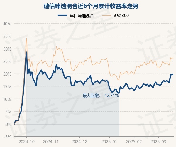 证券之星消息,3月18日,建信臻选混合最新单位净值为0.8618元,累计净值为0.8618元,较前一交易日上涨0.16%。历史数据显示该基金近1个月上涨3.81%,近3个月上涨2.56%,近6个月上涨19.76%,近1年上涨12.05%。该基金近6个月的累计收益率走势如下图: