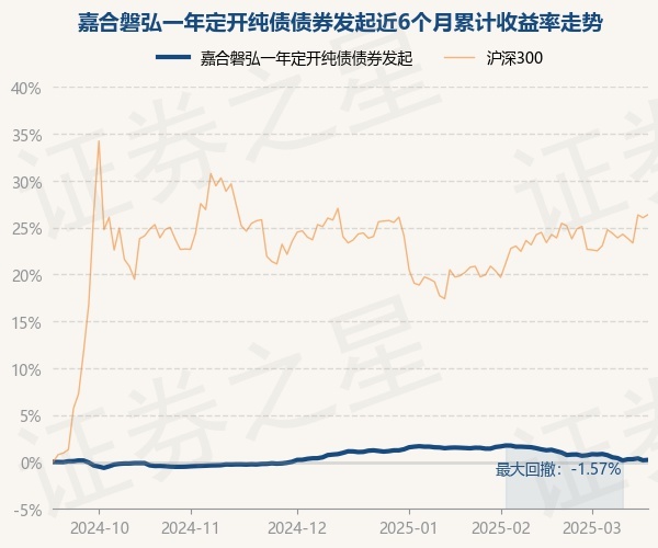 证券之星消息,3月18日,嘉合磐弘一年定开纯债债券发起最新单位净值为1.0508元,累计净值为1.0618元,较前一交易日上涨0.05%。历史数据显示该基金近1个月下跌1.02%,近3个月下跌0.83%,近6个月上涨0.22%,近1年上涨2.23%。该基金近6个月的累计收益率走势如下图: