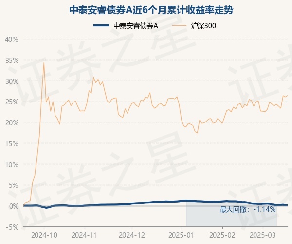 证券之星消息,3月18日,中泰安睿债券A最新单位净值为1.0383元,累计净值为1.0803元,较前一交易日上涨0.0%。历史数据显示该基金近1个月下跌0.73%,近3个月下跌0.77%,近6个月上涨0.11%,近1年上涨2.17%。该基金近6个月的累计收益率走势如下图: