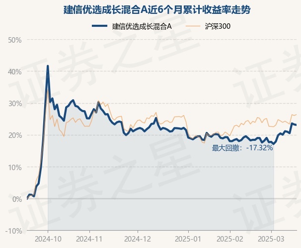 证券之星消息,3月18日,建信优选成长混合A最新单位净值为2.3171元,累计净值为4.2621元,较前一交易日下跌0.12%。历史数据显示该基金近1个月上涨4.11%,近3个月上涨0.94%,近6个月上涨23.1%,近1年上涨1.84%。该基金近6个月的累计收益率走势如下图: