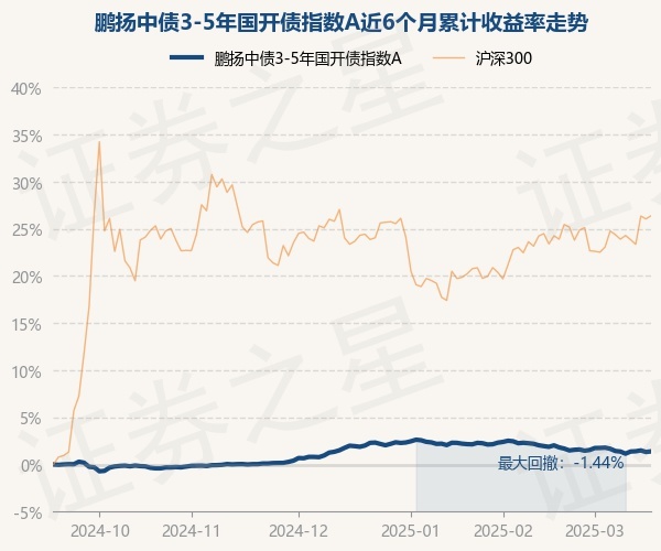证券之星消息,3月18日,鹏扬中债3-5年国开债指数A最新单位净值为1.0339元,累计净值为1.1169元,较前一交易日上涨0.07%。历史数据显示该基金近1个月下跌0.47%,近3个月下跌0.49%,近6个月上涨1.38%,近1年上涨4.92%。该基金近6个月的累计收益率走势如下图: