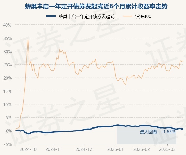 证券之星消息,3月18日,蜂巢丰启一年定开债券发起式最新单位净值为1.0298元,累计净值为1.0698元,较前一交易日上涨0.06%。历史数据显示该基金近1个月下跌0.8%,近3个月下跌0.78%,近6个月上涨0.67%,近1年上涨3.51%。该基金近6个月的累计收益率走势如下图: