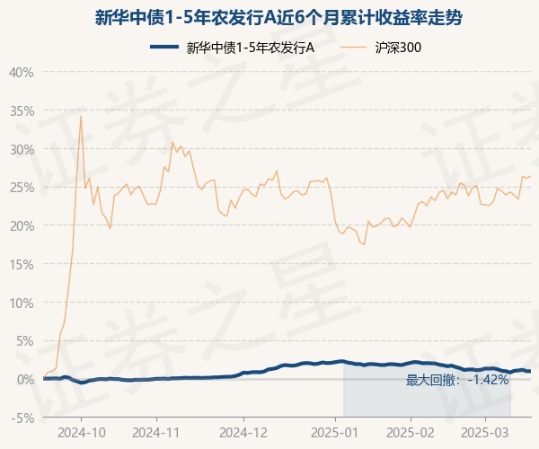 证券之星消息,3月18日,新华中债1-5年农发行A最新单位净值为1.0416元,累计净值为1.1036元,较前一交易日上涨0.0%。历史数据显示该基金近1个月下跌0.6%,近3个月下跌0.67%,近6个月上涨0.99%,近1年上涨2.91%。该基金近6个月的累计收益率走势如下图: