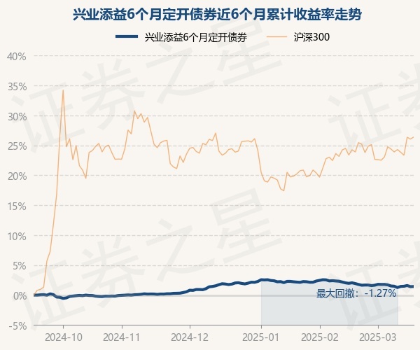 证券之星消息,3月18日,兴业添益6个月定开债券最新单位净值为1.0008元,累计净值为1.0898元,较前一交易日上涨0.02%。历史数据显示该基金近1个月下跌0.52%,近3个月下跌0.32%,近6个月上涨1.43%,近1年上涨4.42%。该基金近6个月的累计收益率走势如下图: