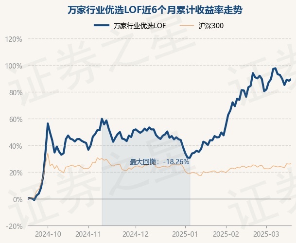 证券之星消息,3月18日,万家行业优选LOF最新单位净值为1.2322元,累计净值为4.7824元,较前一交易日上涨0.63%。历史数据显示该基金近1个月上涨7.46%,近3个月上涨28.7%,近6个月上涨89.57%,近1年上涨46.95%。该基金近6个月的累计收益率走势如下图: