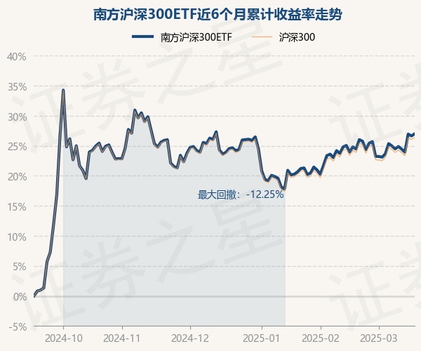 证券之星消息,3月18日,南方沪深300ETF最新单位净值为4.0354元,累计净值为1.8142元,较前一交易日上涨0.28%。历史数据显示该基金近1个月上涨2.44%,近3个月上涨1.96%,近6个月上涨26.98%,近1年上涨14.56%。该基金近6个月的累计收益率走势如下图: