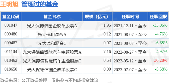 王明旭先生:清华大学核科学与技术专业硕士。2016年7月至2018年5月在阳光资产管理股份有限公司任职研究员;2018年5月加入光大保德信基金管理有限公司,历任研究员,2021年8月至今担任光大保德信瑞和混合型证券投资基金的基金经理。2021年12月11日担任光大保德信国企改革主题股票型证券投资基金的基金经理。2022年8月27日担任光大保德信智能汽车主题股票型证券投资基金基金经理。