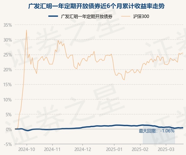 证券之星消息,3月19日,广发汇明一年定期开放债券最新单位净值为1.0073元,累计净值为1.1263元,较前一交易日上涨0.04%。历史数据显示该基金近1个月下跌0.61%,近3个月下跌0.54%,近6个月上涨0.44%,近1年上涨2.22%。该基金近6个月的累计收益率走势如下图: