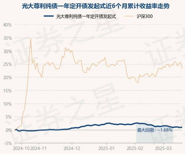 证券之星消息,3月19日,光大尊利纯债一年定开债发起式最新单位净值为1.0177元,累计净值为1.0871元,较前一交易日上涨0.05%。历史数据显示该基金近1个月下跌0.95%,近3个月下跌0.67%,近6个月上涨0.97%,近1年上涨3.84%。该基金近6个月的累计收益率走势如下图: