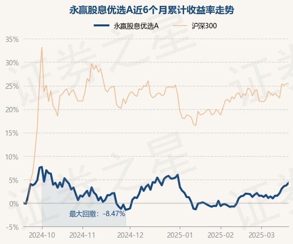 证券之星消息,3月19日,永赢股息优选A最新单位净值为1.3652元,累计净值为1.3652元,较前一交易日上涨0.53%。历史数据显示该基金近1个月上涨2.72%,近3个月下跌0.25%,近6个月上涨4.32%,近1年上涨8.01%。该基金近6个月的累计收益率走势如下图:
