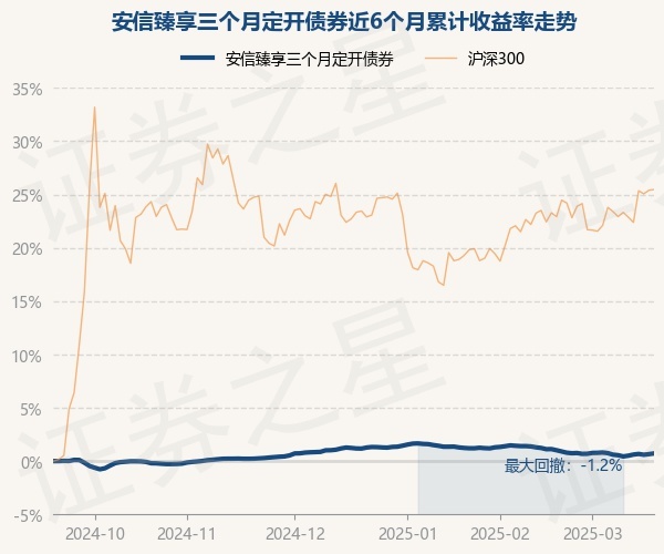 证券之星消息,3月19日,安信臻享三个月定开债券最新单位净值为1.03元,累计净值为1.07元,较前一交易日上涨0.07%。历史数据显示该基金近1个月下跌0.4%,近3个月下跌0.45%,近6个月上涨0.72%,近1年上涨2.62%。该基金近6个月的累计收益率走势如下图: