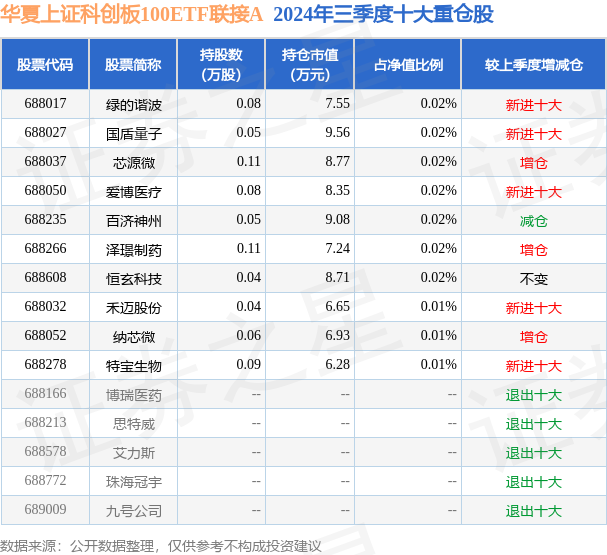 华夏上证科创板100ETF联接A为指数型-股票基金,根据最新一期基金季报显示,该基金资产配置:无股票类资产,无债券类资产,现金占净值比6.36%。基金十大重仓股如下: