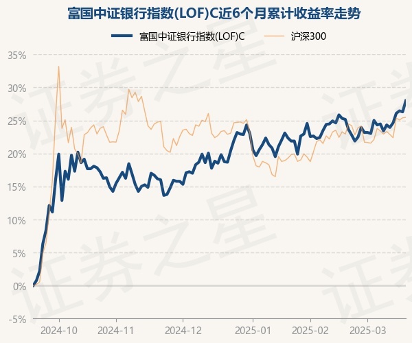 证券之星消息,3月19日,富国中证银行指数(LOF)C最新单位净值为1.679元,累计净值为1.679元,较前一交易日上涨1.33%。历史数据显示该基金近1个月上涨2.13%,近3个月上涨7.77%,近6个月上涨27.97%,近1年上涨34.97%。该基金近6个月的累计收益率走势如下图:
