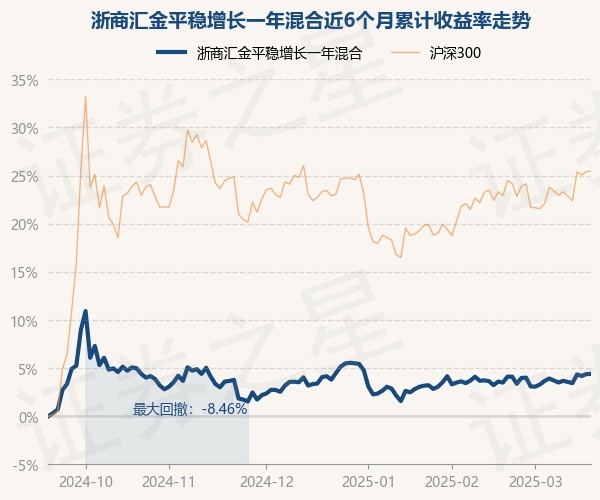 证券之星消息,3月19日,浙商汇金平稳增长一年混合最新单位净值为0.9156元,累计净值为2.4414元,较前一交易日上涨0.02%。历史数据显示该基金近1个月上涨0.77%,近3个月上涨0.23%,近6个月上涨4.39%,近1年上涨2.66%。该基金近6个月的累计收益率走势如下图: