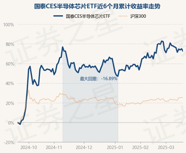 证券之星消息,3月19日,国泰CES半导体芯片ETF最新单位净值为1.2252元,累计净值为2.4504元,较前一交易日下跌1.34%。历史数据显示该基金近1个月上涨0.7%,近3个月上涨8.88%,近6个月上涨72.66%,近1年上涨44.26%。该基金近6个月的累计收益率走势如下图: