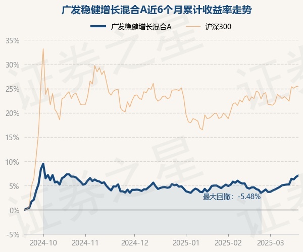 证券之星消息,3月19日,广发稳健增长混合A最新单位净值为1.5033元,累计净值为4.5633元,较前一交易日上涨0.26%。历史数据显示该基金近1个月上涨2.34%,近3个月上涨2.27%,近6个月上涨7.06%,近1年上涨2.54%。该基金近6个月的累计收益率走势如下图: