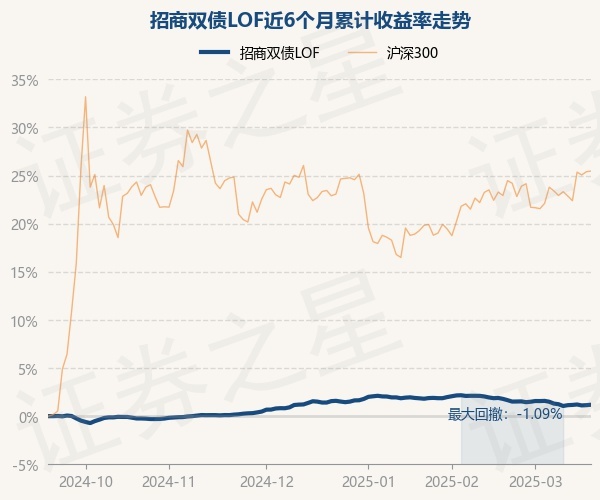 证券之星消息,3月19日,招商双债LOF最新单位净值为1.5884元,累计净值为1.7274元,较前一交易日上涨0.04%。历史数据显示该基金近1个月下跌0.69%,近3个月下跌0.23%,近6个月上涨1.18%,近1年上涨3.24%。该基金近6个月的累计收益率走势如下图: