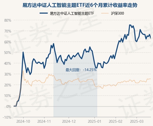证券之星消息,3月19日,易方达中证人工智能主题ETF最新单位净值为1.0201元,累计净值为1.0201元,较前一交易日下跌1.96%。历史数据显示该基金近1个月下跌1.93%,近3个月上涨7.76%,近6个月上涨63.27%,近1年上涨29.78%。该基金近6个月的累计收益率走势如下图: