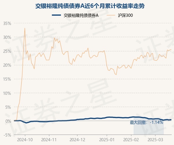 证券之星消息,3月19日,交银裕隆纯债债券A最新单位净值为1.3852元,累计净值为1.4142元,较前一交易日上涨0.07%。历史数据显示该基金近1个月下跌0.71%,近3个月下跌0.39%,近6个月上涨0.38%,近1年上涨2.21%。该基金近6个月的累计收益率走势如下图:
