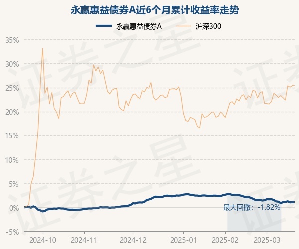 证券之星消息,3月19日,永赢惠益债券A最新单位净值为1.0964元,累计净值为1.2708元,较前一交易日上涨0.04%。历史数据显示该基金近1个月上涨0.09%,近3个月下跌1.04%,近6个月上涨1.12%,近1年上涨4.69%。该基金近6个月的累计收益率走势如下图: