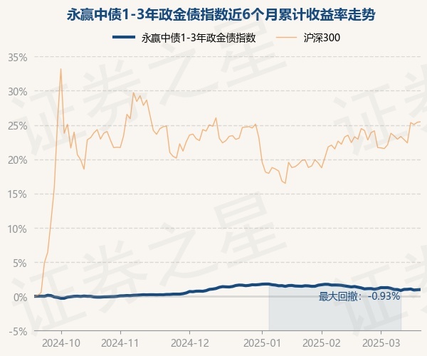 证券之星消息,3月19日,永赢中债1-3年政金债指数最新单位净值为1.0824元,累计净值为1.1954元,较前一交易日上涨0.04%。历史数据显示该基金近1个月下跌0.43%,近3个月下跌0.43%,近6个月上涨0.99%,近1年上涨3.22%。该基金近6个月的累计收益率走势如下图: