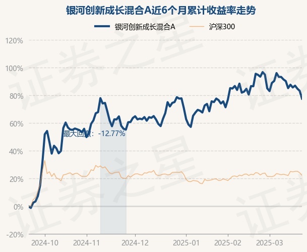 证券之星消息,3月20日,银河创新成长混合A最新单位净值为6.7167元,累计净值为6.7167元,较前一交易日下跌0.86%。历史数据显示该基金近1个月下跌1.79%,近3个月上涨4.66%,近6个月上涨83.28%,近1年上涨58.63%。该基金近6个月的累计收益率走势如下图: