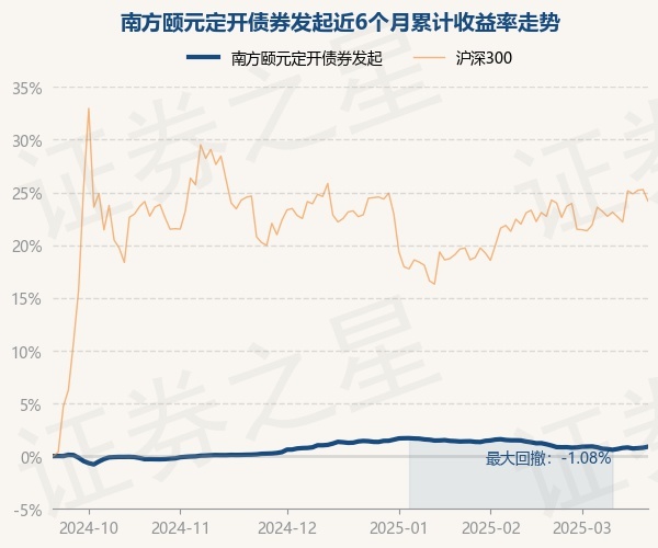 证券之星消息,3月20日,南方颐元定开债券发起最新单位净值为1.2989元,累计净值为1.5052元,较前一交易日上涨0.1%。历史数据显示该基金近1个月下跌0.23%,近3个月下跌0.49%,近6个月上涨0.89%,近1年上涨3.41%。该基金近6个月的累计收益率走势如下图: