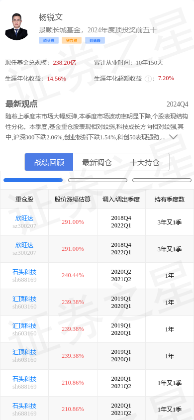 奕瑞科技(688301)是基金经理杨锐文的重仓股。,其在整个职业生涯内年化收益高达14.56%。杨锐文的大佬持仓 - 战绩回顾截图如下: