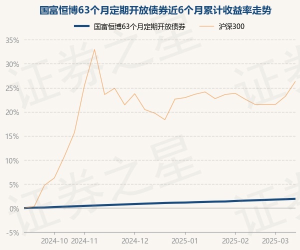 证券之星消息,3月21日,国富恒博63个月定期开放债券最新单位净值为1.0301元,累计净值为1.1667元,较前一交易日上涨0.08%。历史数据显示该基金近1个月上涨0.29%,近3个月上涨0.91%,近6个月上涨1.91%,近1年上涨3.99%。该基金近6个月的累计收益率走势如下图: