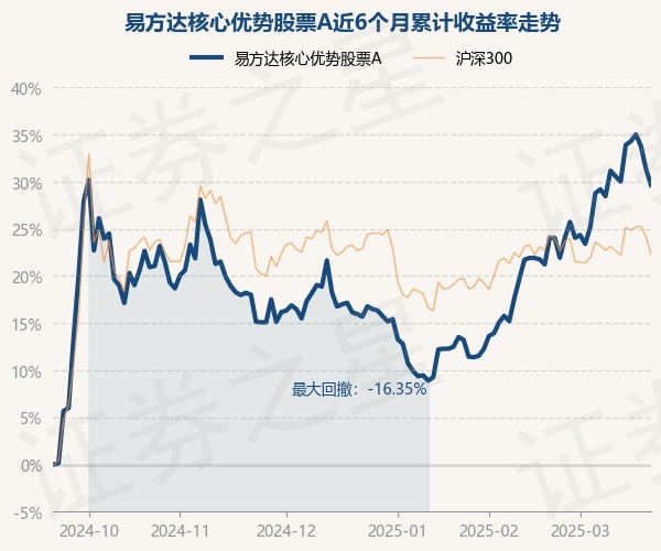 证券之星消息,3月21日,易方达核心优势股票A最新单位净值为0.7667元,累计净值为0.7667元,较前一交易日下跌1.3%。历史数据显示该基金近1个月上涨4.5%,近3个月上涨11.81%,近6个月上涨29.64%,近1年上涨5.59%。该基金近6个月的累计收益率走势如下图: