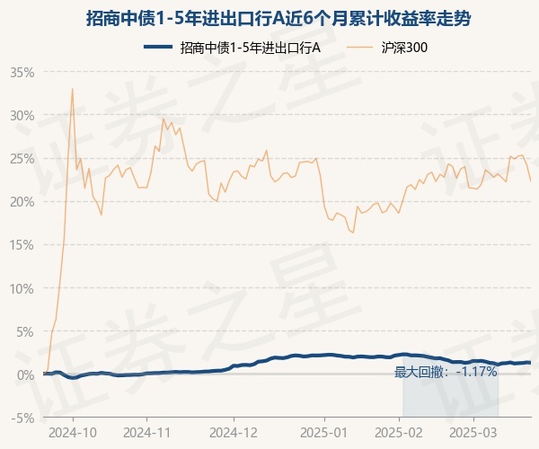 证券之星消息,3月21日,招商中债1-5年进出口行A最新单位净值为1.0487元,累计净值为1.1727元,较前一交易日下跌0.03%。历史数据显示该基金近1个月下跌0.27%,近3个月下跌0.77%,近6个月上涨1.28%,近1年上涨3.73%。该基金近6个月的累计收益率走势如下图: