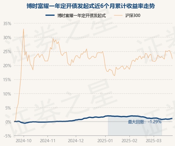 证券之星消息,3月21日,博时富耀一年定开债发起式最新单位净值为1.016元,累计净值为1.0645元,较前一交易日上涨0.03%。历史数据显示该基金近1个月下跌0.38%,近3个月下跌0.49%,近6个月上涨1.07%,近1年上涨3.35%。该基金近6个月的累计收益率走势如下图: