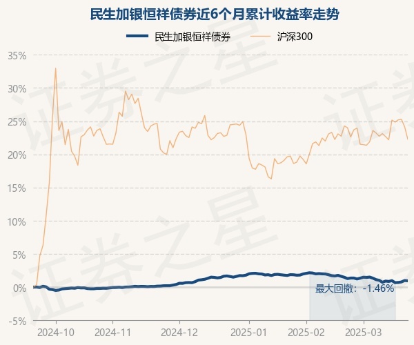 证券之星消息,3月21日,民生加银恒祥债券最新单位净值为1.0726元,累计净值为1.1081元,较前一交易日下跌0.05%。历史数据显示该基金近1个月下跌0.53%,近3个月下跌0.69%,近6个月上涨0.95%,近1年上涨3.05%。该基金近6个月的累计收益率走势如下图: