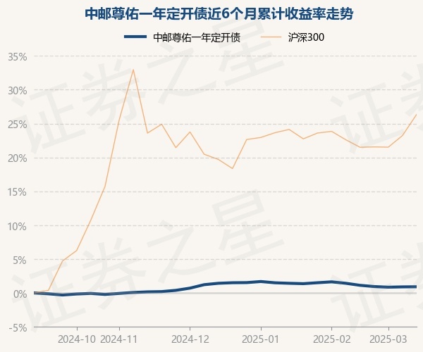 证券之星消息,3月21日,中邮尊佑一年定开债最新单位净值为1.087元,累计净值为1.087元,较前一交易日上涨0.02%。历史数据显示该基金近1个月下跌0.21%,近3个月下跌0.5%,近6个月上涨0.92%,近1年上涨3.45%。该基金近6个月的累计收益率走势如下图: