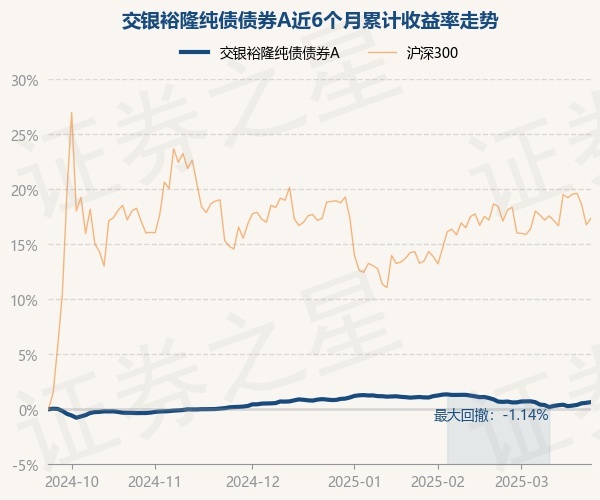 证券之星消息,3月24日,交银裕隆纯债债券A最新单位净值为1.3887元,累计净值为1.4177元,较前一交易日上涨0.06%。历史数据显示该基金近1个月下跌0.04%,近3个月下跌0.23%,近6个月上涨0.65%,近1年上涨2.45%。该基金近6个月的累计收益率走势如下图: