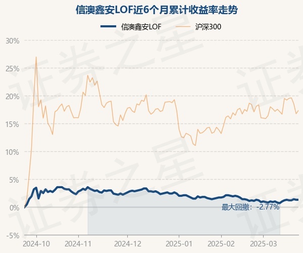 证券之星消息,3月24日,信澳鑫安LOF最新单位净值为0.997元,累计净值为1.375元,较前一交易日上涨0.0%。历史数据显示该基金近1个月上涨0.1%,近3个月下跌1.19%,近6个月上涨1.31%,近1年上涨0.73%。该基金近6个月的累计收益率走势如下图: