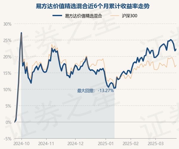 证券之星消息,3月24日,易方达价值精选混合最新单位净值为1.1259元,累计净值为3.9009元,较前一交易日上涨0.38%。历史数据显示该基金近1个月上涨0.27%,近3个月上涨5.47%,近6个月上涨22.24%,近1年上涨4.94%。该基金近6个月的累计收益率走势如下图: