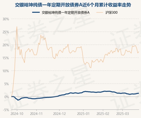 证券之星消息,3月24日,交银裕坤纯债一年定期开放债券A最新单位净值为1.0527元,累计净值为1.1737元,较前一交易日上涨0.05%。历史数据显示该基金近1个月下跌0.05%,近3个月下跌0.07%,近6个月上涨1.29%,近1年上涨3.17%。该基金近6个月的累计收益率走势如下图: